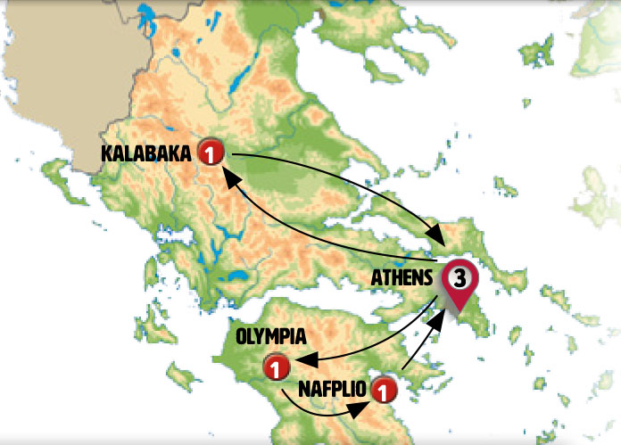Iconic cities and breathtaking landscapes for Discover Greece, many cultural and historical highlights of one of world's most classic countries. An unforgettable holiday trip, discovering all the secrets of Athens, Kamena Vourla, Meteora, Kalabaka, Delphi, Athens, Corinth, Mycenae, Tripoli, Olympia, Patras, Nafplio, Epidaurus, Poros and Aegina.