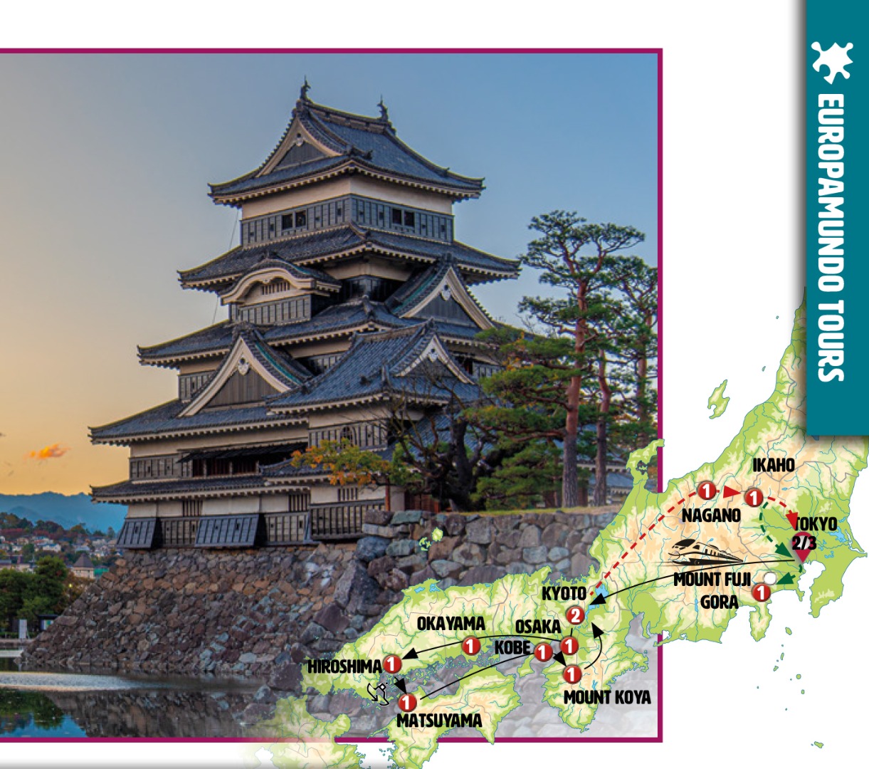 (TOKYO - KYOTO - NARA - OSAKA - ENGYO-JI - HIMEJI - OKAYAMA - KURASHIKI - HIROSHIMA - ITSUKUSHIMA - HIROSHIMA - MATSUYAMA - KOTOHIRA - TAKAMATSU - NARUTO - KOBE - OSAKA - MOUNT KOYA - KYOTO - TSUMAGO - MATSUMOTO - NAGANO - MONKEY PARK - KUSATSU - IKAHO ONSEN - NIKKO - TOKYO). (No minimum passengers for the tour)