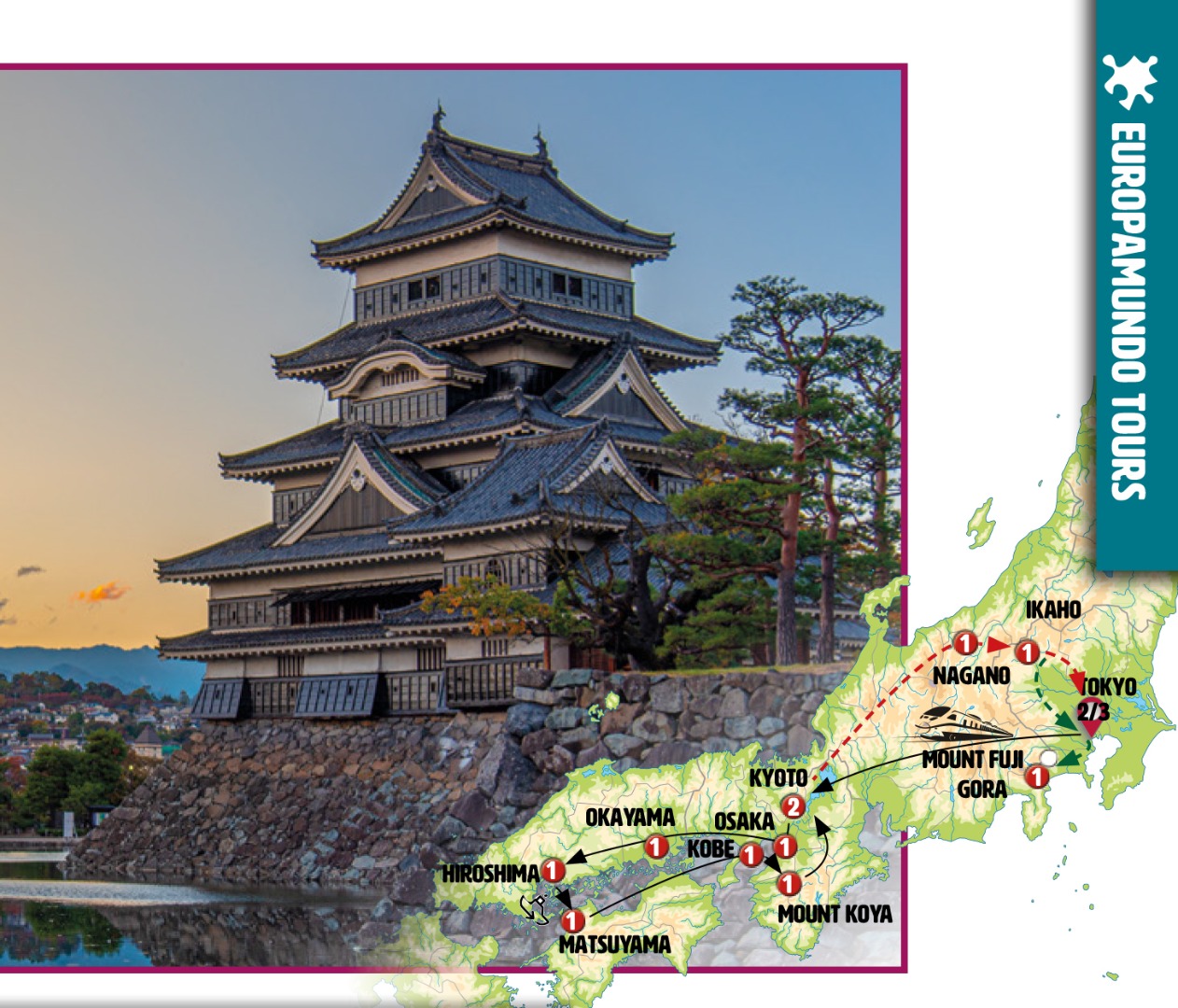 Iconic cities and breathtaking landscapes through Japan´s Landscapes and Mount Fuji, many cultural and historical highlights of one of world's most classic countries. An unforgettable holiday trip, discovering all the secrets of Tokyo, Kyoto, Nara, Osaka, Engyo-Ji, Himeji, Okayama, Kurashiki, Hiroshima, Itsukushima, Hiroshima, Matsuyama, Kotohira, Takamatsu, Naruto, Kobe, Osaka, Mount Koya, kyoto, Tsumago, Matsumoto, Nagano, Monkey Park, Kusatsu, Ikaho Onsen, Nikko and Tokyo.