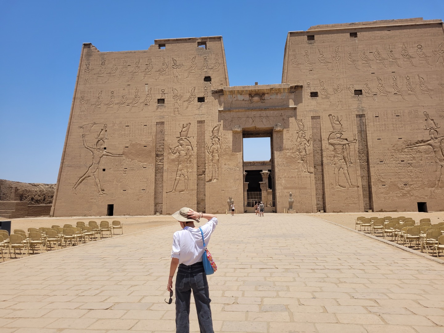 Colazione e partenza per la visita a Calesas ^ Carrozze trainate da cavalli ^ Il Tempio di Edfu (dedicato al dio Horus il Falco, il meglio conservato in Egitto. Il tempio fu costruito su rovine molto più antiche risalenti a Ramses III, e fu eretto sopra centottanta anni sotto una varietà di sovrani durante il periodo tolemaico in Egitto. Questo periodo rappresentò un periodo di dominio greco; tutti i faraoni erano discendenti di Tolomeo, un generale dell'esercito di Alessandro Magno che prese il controllo della regione pochi secoli prima la costruzione del tempio. Tuttavia, il tempio incarna l'architettura tradizionale dell'antico Egitto ed è in gran parte privo di influenze ellenistiche. Il tempio stesso è dedicato al culto del dio egizio Horus, che fu spesso fuso con il dio greco Apollo. In Infatti, la città di Edfu fu ribattezzata Apollonópolis Magna durante il dominio greco-romano in Egitto. Molte delle iscrizioni trovate Così nel tempio di Edfu descrivono quello che è conosciuto come il "Sacro Dramma". La storia descrive il conflitto tra Horus, la divinità delle fertili terre egiziane vicino al Nilo, e Seth, la divinità del deserto egiziano circostante, mentre Horus cerca vendetta per l'omicidio di suo padre, Osiride. Questa storia è stata ricreata ogni anno attraverso le cerimonie degli antichi egizi nel complesso del tempio.